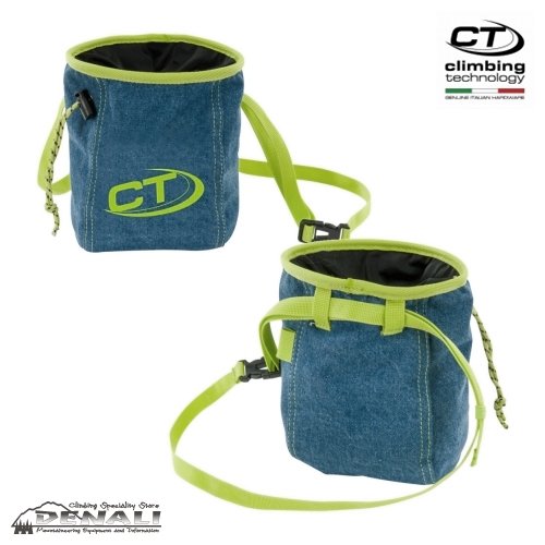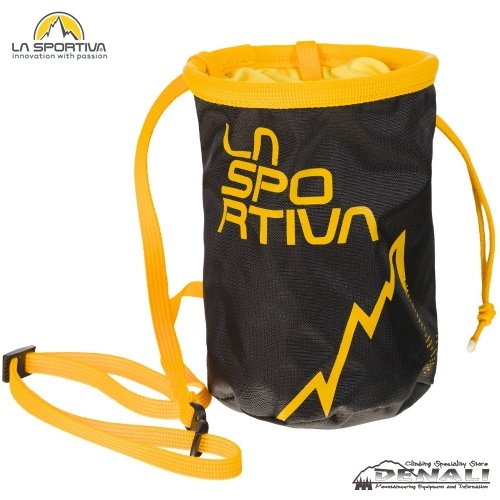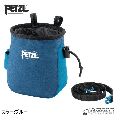 後方にスナップボタンを備え、ハーネスに直接クリップ可能(岩場向けにナイロンベルトも付属)。