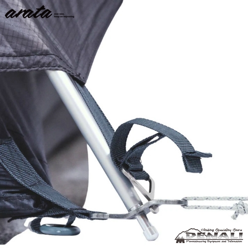 スリーブハブガイポイントは変位の大きいテント頂上部から長辺側をペグダウンすることにより、テントの耐風性を高めるarataの独自の機構です。(オプションのエマージェンシーガイラインキットを利用するとより便利です)
