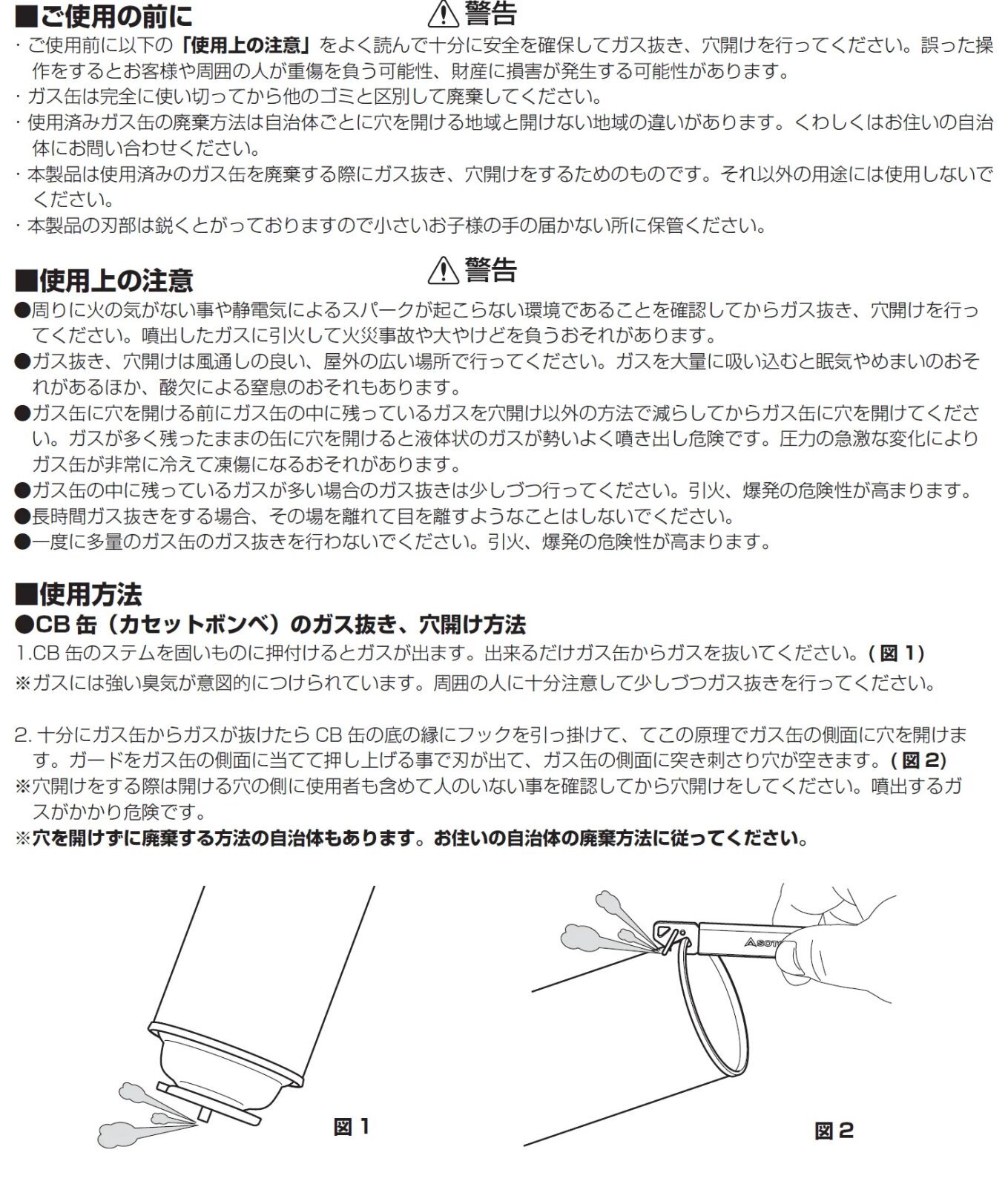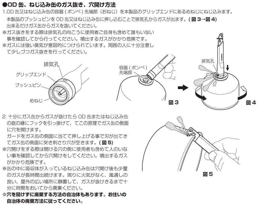 また、穴を開けずにガスを抜くこともできるため、廃棄方法に応じて使い分けが可能です。